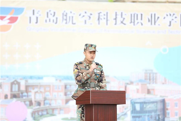 青岛航空科技职业学院副总教官、学生处副处长刘克刚先生带领全体师生进行宣誓。学生宣誓词:传承善与美德,传递爱与快乐;认真参加军训,刻苦磨砺意志;完善自我,创造生活;努力成为:标准的军人,高度职业化的民航员工、现代的绅士与淑女。