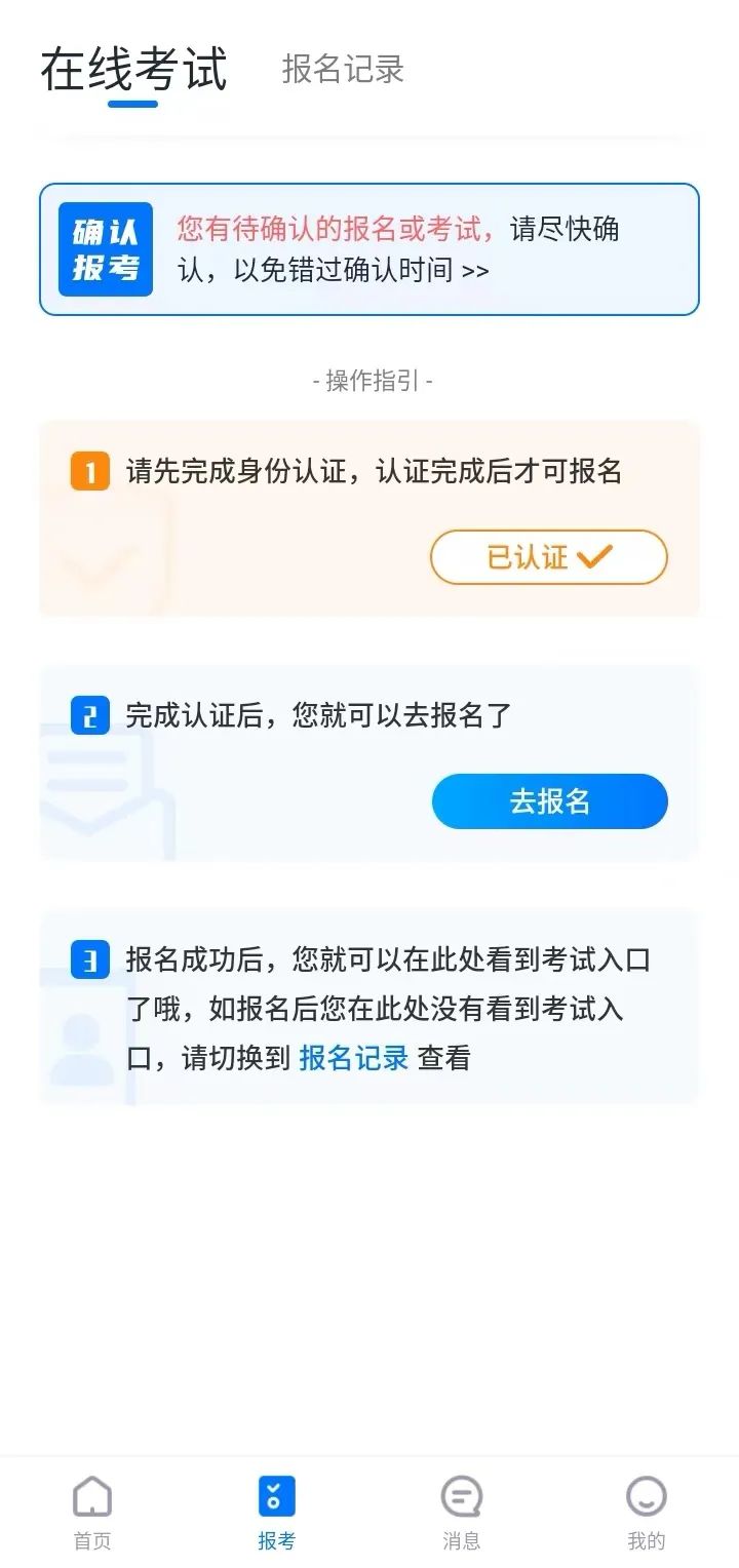 认证通过后,【报考】页面上方会出现确认报考提醒,请点击进入去确认考试。