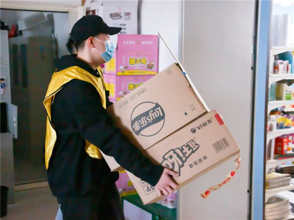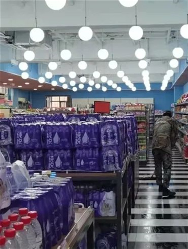 超市结算现场,志愿者们扫码、结账、出单.....有条不紊;物资储存室内,在校全体党员同志装卸、搬货、理货通力协作;货架前,老师引导同学们排队、挑选......秩序井然。