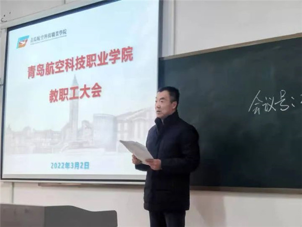 在新的一学期,为进一步提升教师队伍素质水平,促进学校更加稳定发展,2022年3月2日下午,青岛航空科技职业学院召开2022年新学期教职工大会。泛美教育集团特聘专家曹慧贤,校长杨新春,副校长曹青、罗斌、何念兵,党建联络员许广生、魏钦冰等领导出席会议,全体教职工参加会议。