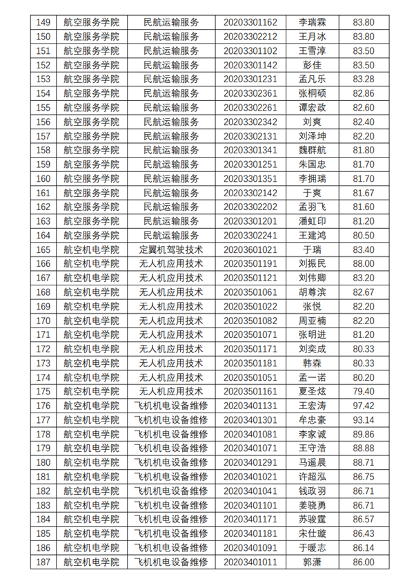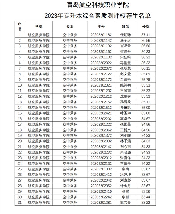 青岛航空科技职业学院2023年普通高等教育专科升本科考试综合素质测评校荐生名单公示
