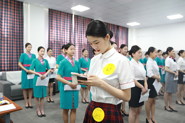 初试环节,经过身高体重测量后,同学们分组进入面试厅,并进行自我介绍、客舱广播词测试等,面试官则根据同学们的表现进行选择,满足条件的同学进入复试环节。