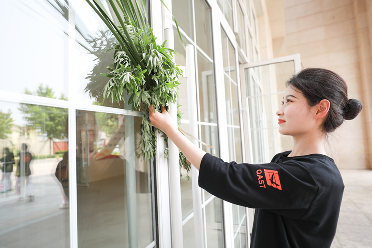 "手执艾旗招百福,门悬蒲剑斩千邪"。在民间,家家户户都有在端午挂艾草、菖蒲的习俗。挂上艾草和菖蒲,有驱邪避障之功效,同时也有着祈福平安健康的意味。同学们将做好的花束悬于校门两侧、挂于老师们的办公室门口,为全校师生祈福祝祷。