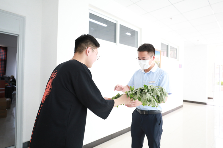 “带个香囊袋,不怕五毒害”。艾草是端午节的必备药材,做成香囊随身佩带可以避邪驱瘴。一折一捻、一拿一塞,老师们亲手将混合好的材料连同祝愿一同塞进香囊装并赠与同学们。小小的香囊饱含着对青学子们美好的祝福和深切的期盼,同学们拿出手机纪念自己的礼物,现场一片欢声笑语,其乐融融。
