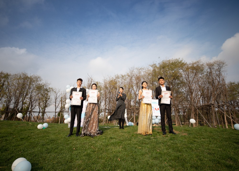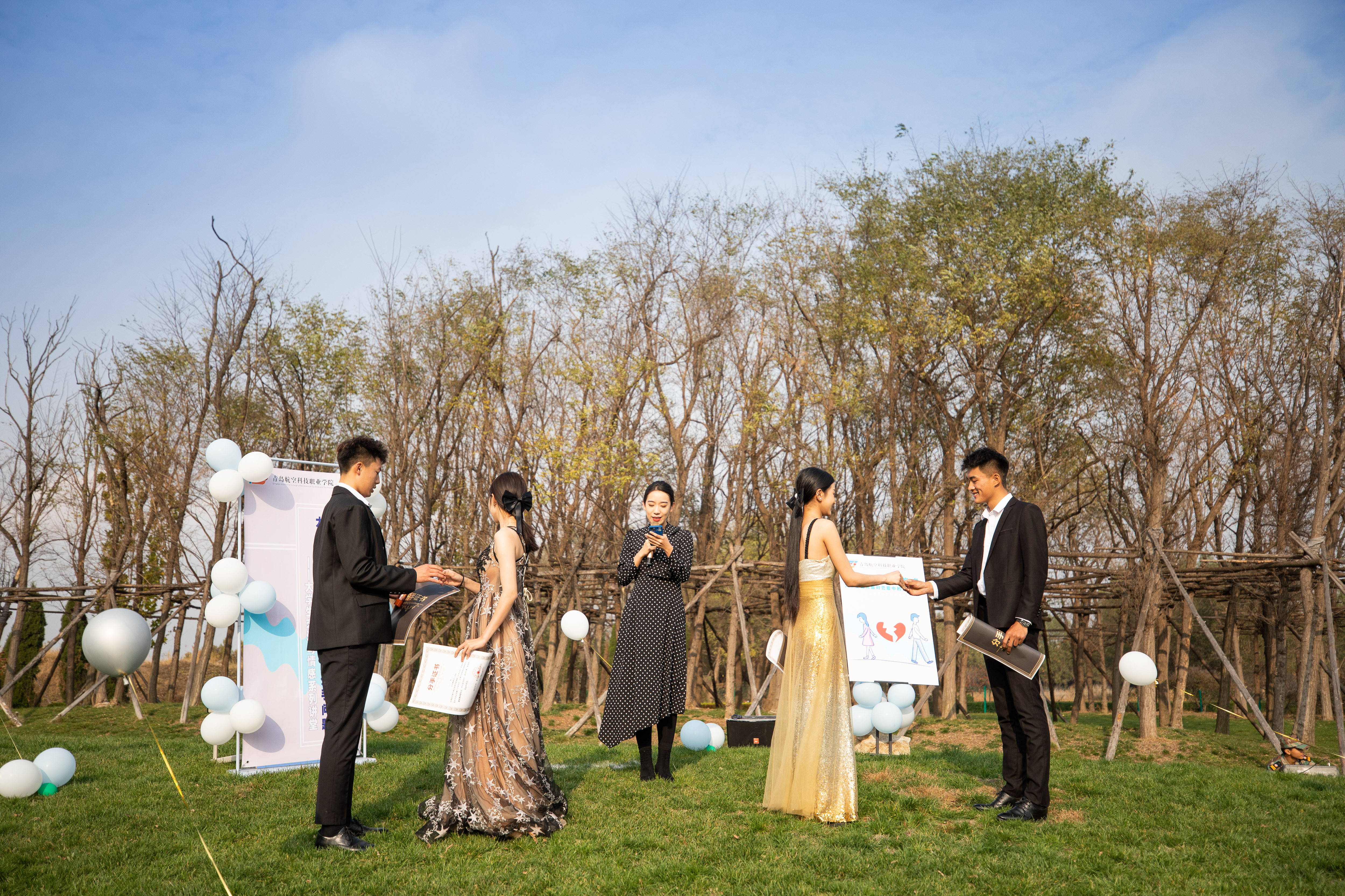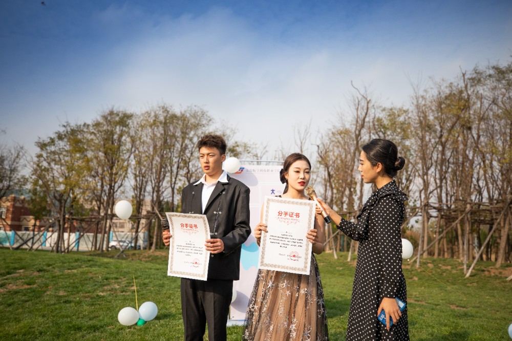 湛蓝的天空、柔软的草地、明艳的气球,两对已经分手的校园情侣身着精美的礼服、带着精致的妆容在极具氛围感的音乐中登场,开启他们的“快乐分手”仪式。仪式上,两对“旧人”互相归还恋爱礼物,并由学院副院长为两对“旧人”颁发分手证书,宣告各自从此恢复单身状态,在老师与同学们的共同见证下他们从恋人回归到好朋友的身份,不哭不闹不纠缠,快乐分手。