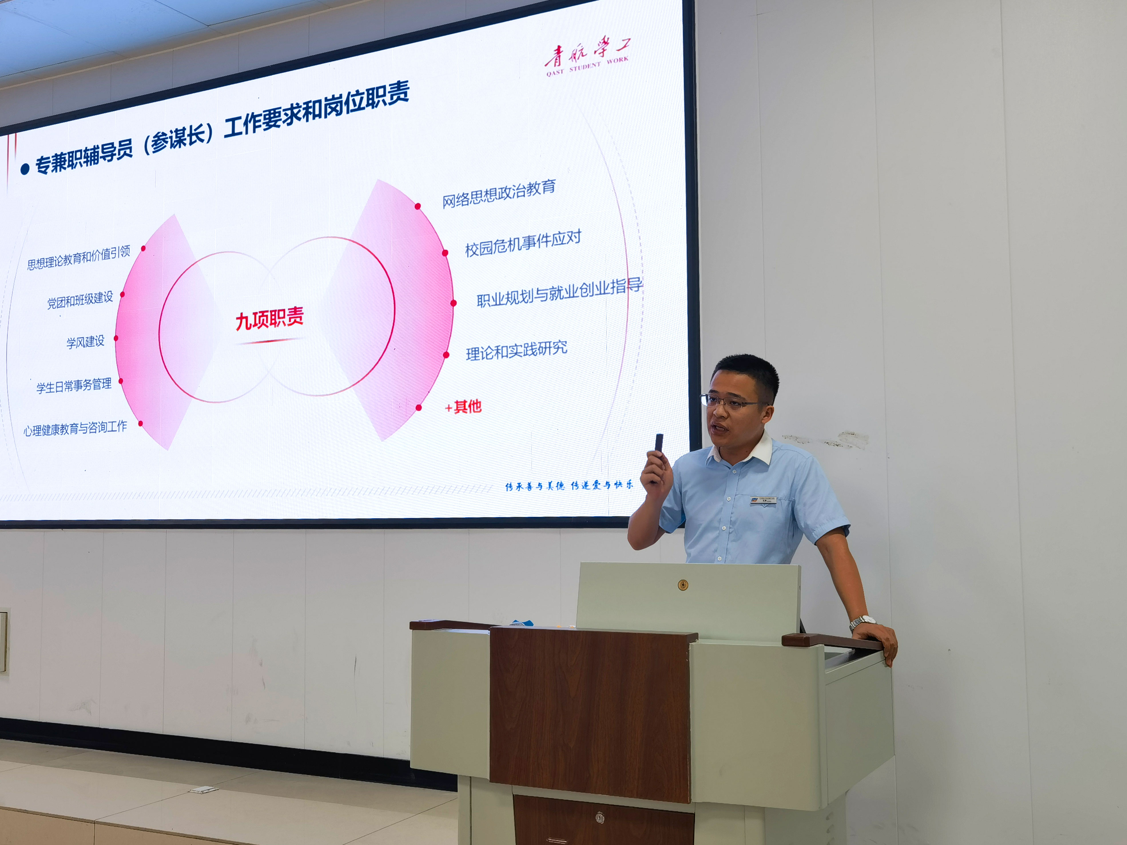本次培训张鹏处长围绕辅导员工作职责、工作方法(要点)、学习提升、诉求处理等方面结合实例展开培训并与全体参培老师分享经验,交流心得,提出问题,解答问题。还对参培老师提出要抓好学团工作、创新发力取佳绩,要进一步加强对各级、类政策的理解与掌握,提高凝聚力,落实工作安排,以严谨、细致、认真、负责的态度,提升育人质量、服务,促进学生成长成才。