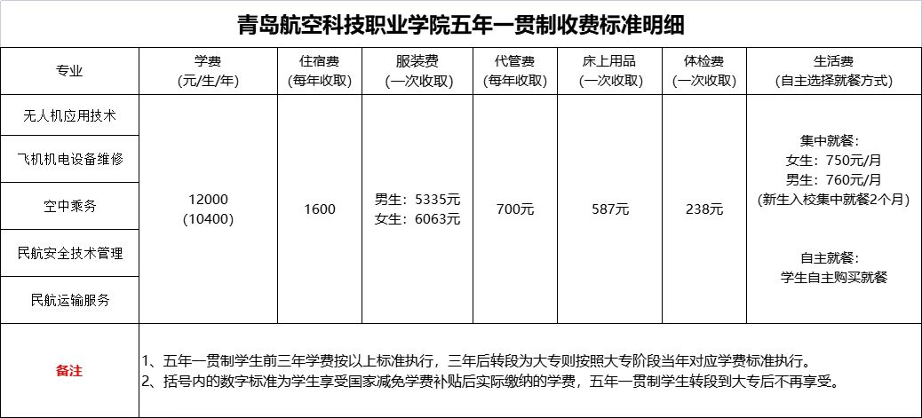 青岛航空科技职业学院2023学年五年一贯制收费标准明细公示