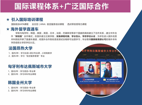 学院引入国际航协IATA、全日空 ( ANA)航空服务培训,西点军校领导力等国际培训课程,与匈牙利、韩国、美国、英国、日本、法国、巴基斯坦等多个国家的高校建立了合作关系,建立中外合作“双校园”合作模式,在国外建立泛美学院,实施课程对接、学分互认、学历学位认证,为学生进入国外优质本科院校开辟了直通车通道,经国外合作院校语言测试合格即可出国学习,毕业取得国家教育部认可的海外本科学历或硕士学历学位认证。