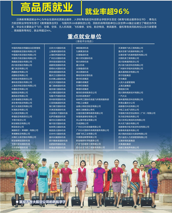 泛美教育集团就业中心为毕业生提供优质就业服务,入学时签订《教育与就业服务合同》,与国内外200余家航空公司、民航机场等民航单位以及世界500强企业建立了稳定合作关系,毕业生主要就业于飞行、空乘、空保、无人机驾驶、”飞机维修、 安检、航空物流、贵宾服务、值机等各类民航岗位以及行政管理、高端服务等岗位,就业率超过96%。